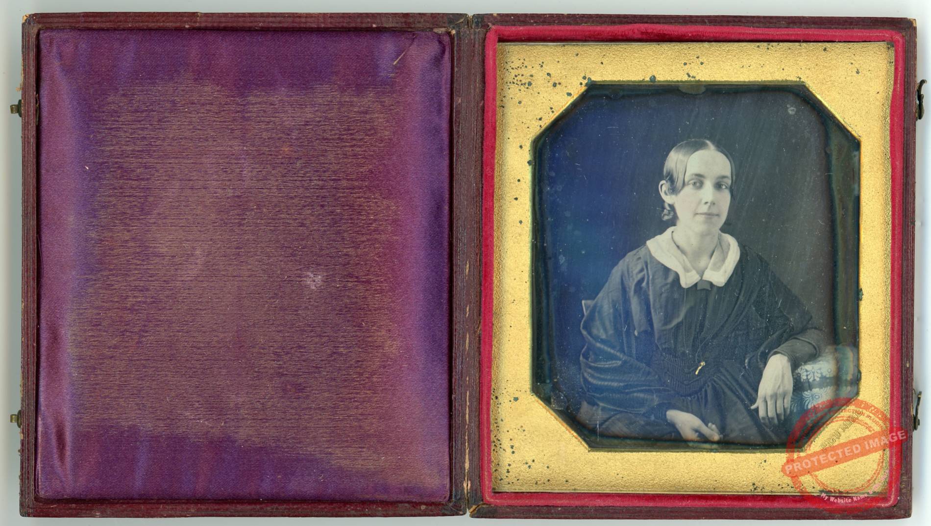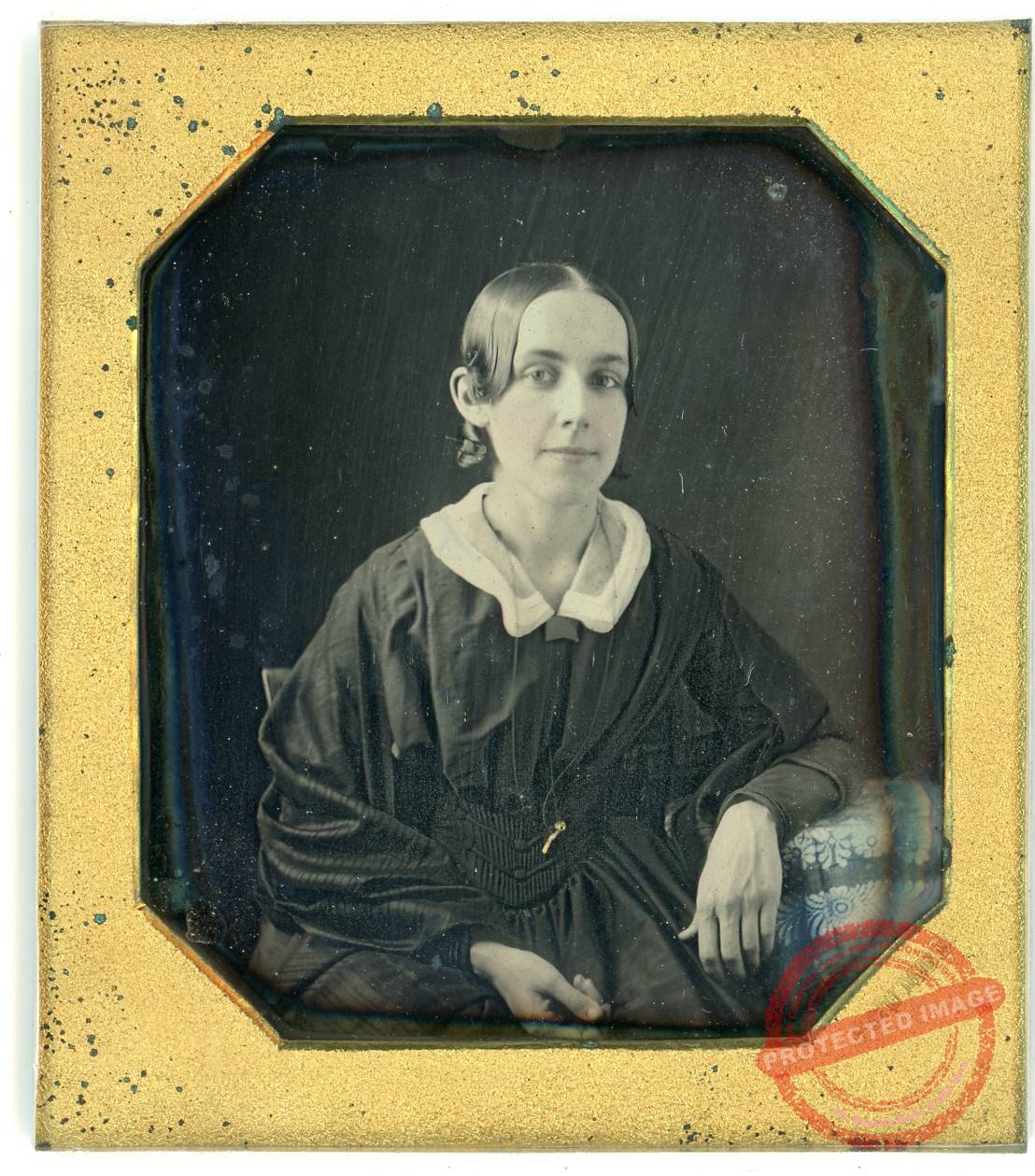 Oversized (4.25″ x 3.75″) quarter-plate daguerreotype by John Plumbe, Jr., NY, identified on slip of paper as “Emily Stevens aged 9 years, Addie aged 13 years, Feb. 6, 1845.”