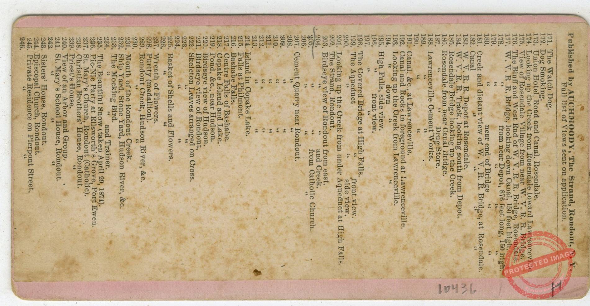 Auchmoody, D.J.-HV 40137. 102. Second Reformed Church, Kingston, NY. Photographic van of Auchmoody at lower left. 51042. View near Shandaken. 51043. 29. N.Y.K. & S.R.R. Track at Shandaken. 51047. Eddyville Bridge at Eddyville, Ulster Co., N.Y. 51055. 130. Rondout Creek and South Rondout. 51056. 125. Stone Yard at Wilbur. 51057. 125. Stone Yard at Wilbur. 51058. 51. Glenerie, White Lead Works. 51059. 201. Looking up the Creek from under Aqueduct at High Falls. 51060. Lawrenceville Cement Works looking up Canal, N.Y. Rosendale Cement. 51061. Lawrenceville Cement Works looking down Canal, N.Y. 51062. Canal at Lawrenceville, N.Y. Rocks in foreground. 51063. No. 94. Upper End of Wall St. at Front St., Kingston, NY. 51064. W.V.R.R. Bridge at Rosendale, NY. 51066. W.V.R.R. Bridge, Rosendale, NY. 51072. 177. W.V.R.R. Bridge, looking down Canal, 150 feet high. 51087. 254. Fair and Festival in Presbyterian Chapel. 51089. Entrance to Cement Quarry at Creek Locks, Ulster Co., NY. 51091. 95. Wall Street, Kington. 51092. 98. Fair Street, Kingston. 51112. 65. Flower Garden. 51122. 189. Lawrenceville Cement Works. 51123. Canal at Lawrenceville from Towpath. 51124. Rosendale Bridge looking up the creek. 51125. Canal & distant view of Bridge at Rosendale. 51126. Covered Bridge at High Falls, N.Y. 51127. Store at Rosendale, N.Y. 51128. Fire Station & Hose Carriage of Rondout. 51129. David J. Auchmoody, Lester’s father. 51130. Peter J. Auchmoody, Port Ewen, NY. Grandfather of Lester D. Auchmoody. 51142. Rustic View. 51153. Overview of Lawrenceville, NY, Catskill Mts. 51156. 141. Rondout Creek and Coal Docks. 51157. 203. Birdseye view of Rondout from east. 51163. Aqueduct at High Falls. 51164. South view from Sleightsburgh NY. 51165. Rondout from Sleightsburgh. 51166. 153. Coal Dock, Creek, South Rondout, Hussy’s Hill, &c. 51168. 186. Rosendale from near Canal Bridge. 51169. 128. Wilbur Road and Rondout Creek. 51172. 140. Rondout Creek. 51173. Rondout, Kingston. 51206. Civil War Veterans Parade, Ulster County. 51700. Birdseye View of Rondout and Creek.