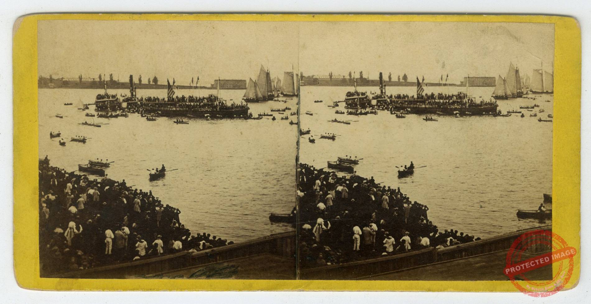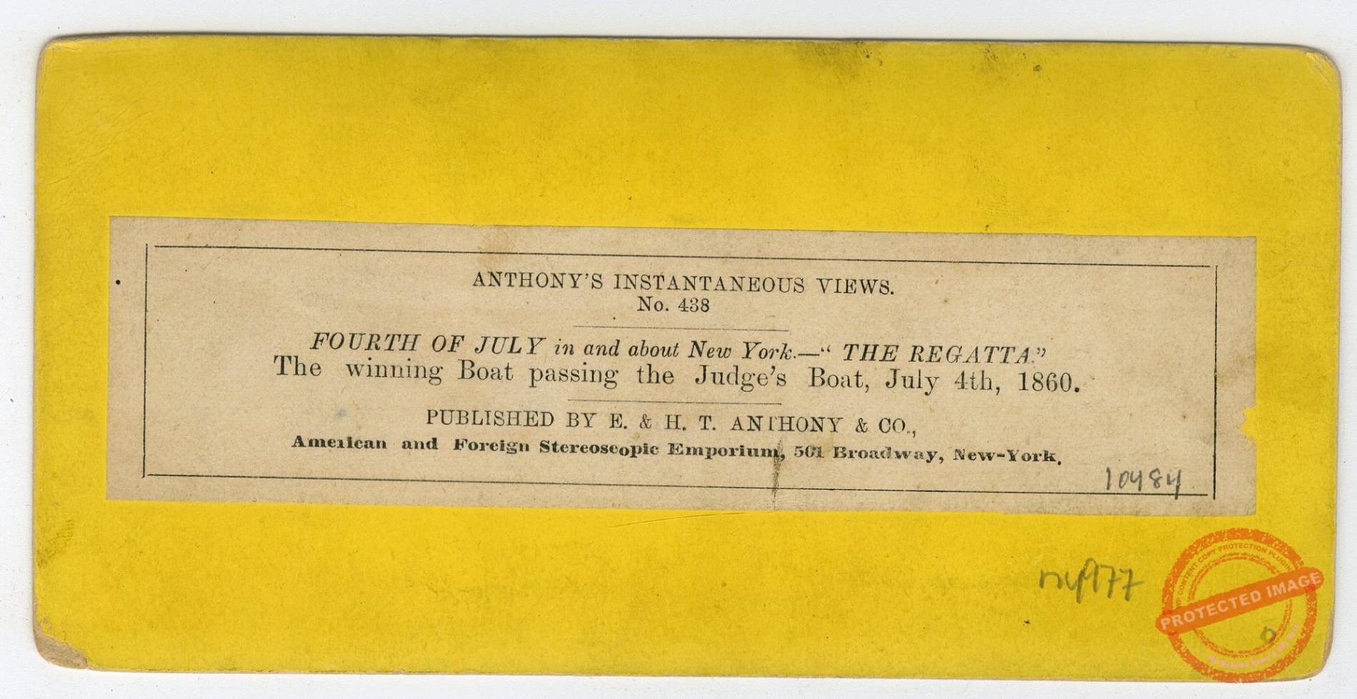 Park Row from Tryon Row, the City Hall Park on the right, showing the Times Building and a distant view of St. Paul’s Church. European issue: “Amerique du Nord. Le Broadway a New-York,” in manuscript on verso. Also label of E. Mayer, Oculiste–Opticien, Paris.
