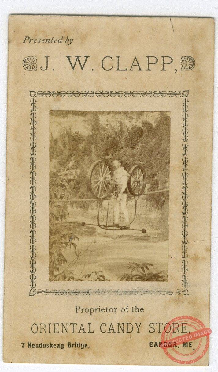 Presented by J.W. Clapp, Proprietor of the Oriental Candy Store, 7 Kenduskeag Bridge, Bangor, Me. Image of Professor Jenkins with his velocipede on the high wire.