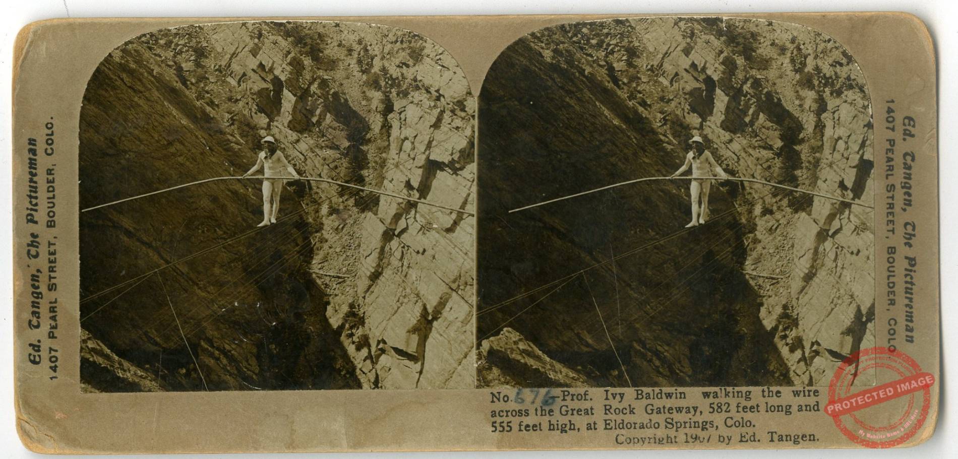 No. 676. Prof. Ivy Baldwin walking the wire across the Great Rock Gateway, 582 feet long and 555 feet high, at Eldorado Springs, Colo.